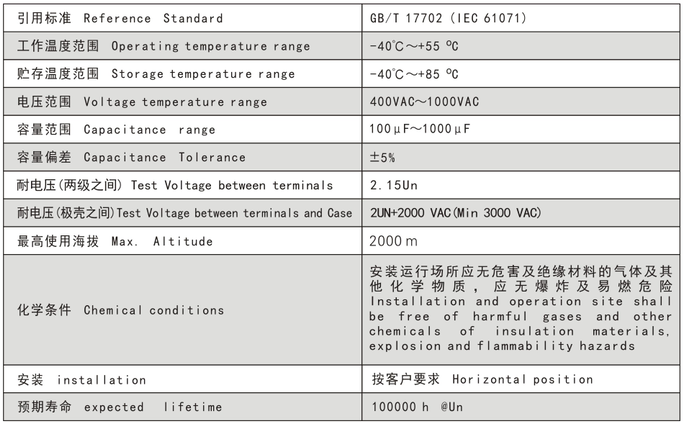 High voltage withstand, self-healing, High ripple current, high dv/dt withstand, large capacitance, small size, simple and convenient instanllation